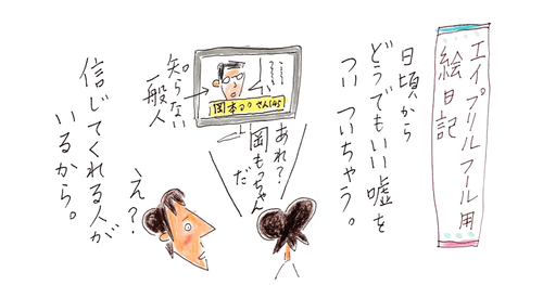 エイプリルフールにちなんだ話 2026年04月01日 本日ちょうど4月1日。エイプリルフールなので、嘘にまつわる絵日記を。トイレの嘘はまさか信じてると思ってなくて、1週間後に↓新幹線のお風呂はもったいなかったな↓:::::::::::::::::::::::::: 水曜日のフクダカヨ絵日記::::::::::: ... 続きを読む 本日ちょうど4月1日。エイプリルフールなので、嘘にまつわる絵日記を。トイレの嘘はまさか信じてると思ってなくて、1週間後に↓新幹線のお風呂はもったいなかったな↓:::::::::::::::::::::::::: 水曜日のフクダカヨ絵日記::::::::::::::::::::::::::: タグ :#エイプリルフール#嘘#うそ#四月バカ
