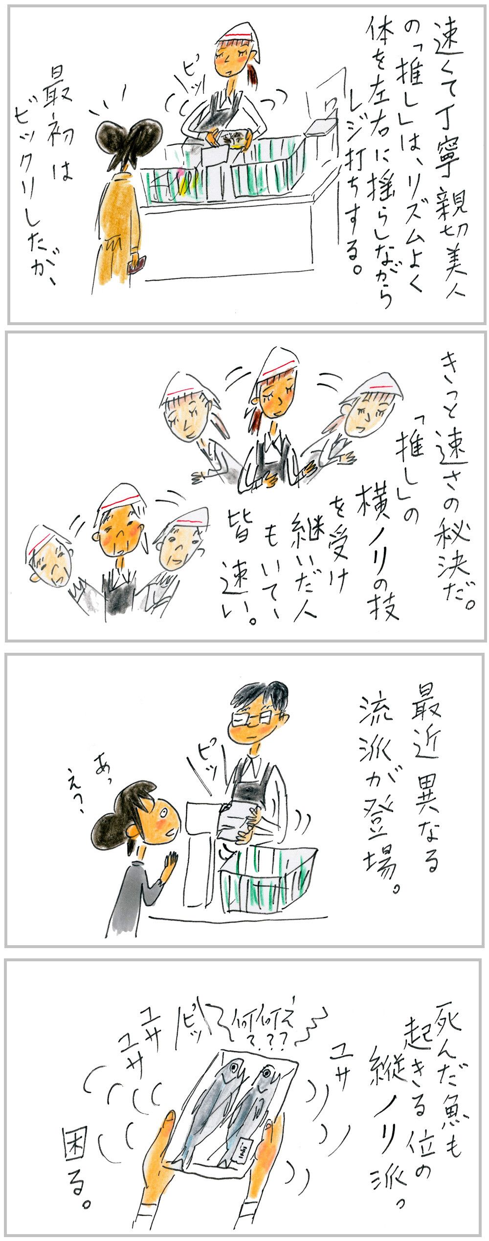 横ノリ縦ノリ 2021年05月26日 近所のスーパーでは私の「推し」の秘技が少しづつ広まっているようだ。しかし… ... 続きを読む 横ノリはやってみたけど真似できない。熟練の技とリズム感が必要。縦ノリは、ピッてする時の癖なんだろうけど、とても気になる。ビール買えない。早く「推し」からの指導が入りますように。推しの話↓http://fukudakayoenikki.blog.jp/archives/36813704.html::::::::::::::今日は皆既月食だって:::: 水曜日の ::::フクダカヨ絵日記:::::::::::::: タグ :#レジ#スーパー#推し#縦ノリ#横ノリ